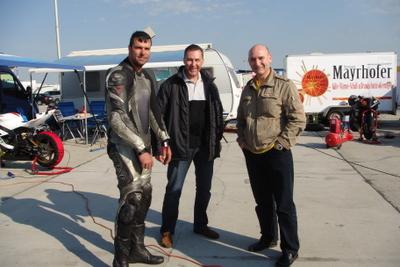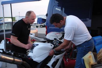 Am Samstag Morgen erneuerte Hannes die Bremsflüssigkeit an Helmuts Motorrad, und drehte danach einige Proberunden. Anschließend machte sich Hannes auf den Weg durch das Fahrerlager um Rennfahrerkollegen, Freunde und Bekannte die er schon fast ein Jahr nicht mehr gesehen hatte zu besuchen. Da auch der MotoGP Zirkus bereits sein Lager aufschlug, war nicht mehr das ganze Areal frei befahr .- bzw. begehbar, und somit auch nicht viel Stellen verfügbar um sich die Zeittrainings anzusehen. Tanja half wie fast immer bei den Startvorbereitungen mit und verfolgte gemeinsam mit Hannes die Rennen in der Boxengasse. Als Helmut nach der ersten Runde nicht mehr an uns vorbeikam, wurden die beiden etwas unruhig. Doch kurz darauf bog Helmut mit gesenktem Haupt in die Boxengasse ein, und zeigte abermals auf den Bremshebel. Hannes und Mario machten sich gleich daran die Bremspumpe zu demontieren, und durch eine andere zu ersetzen. Im nachhinein stellte sich heraus das die Druckmanschette an Helmuts Magurapumpe defekt war. |  |