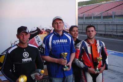 Am Sonntag standen die Rennen der Klassen SSP, SBK und GP auf dem Plan. Roman war vom Langstreckenrennen noch so ausgepowert das er auf den Start in der SSP-Klasse verzichtete. Soli, Bertl und Gerald ließen sich den Spaß hingegen nicht nehmen und nahmen bei über 30° Grad ihre Startpositionen ein. Bertl ging von der Poleposition ins Rennen und konnte einen souveränen Start-Zielsieg einfahren. In der Klasse SBK ging Rolfi mit seiner YZF R7 von Position drei ins Rennen und konnte sich in der ersten Runde hinter dem Führenden Martin Erlacher positionieren. Nach einigen Runden bemerke Rolfi das er wesendlich schneller fahren konnte, ging in Führung und baute diese bis zum Ende des Rennens auf vierzehn Sekunde aus. Hermann, Wolfgang und Ralph der sich bei seinem Sturz leicht am Bein verletzte gingen in der Klasse GP an den Start. Wolfgang beendete das Rennen in der dritten Runde, da er nach seinem Schlüsselbeinbruch noch leichte Konditionsprobleme hatte. Hermann und Ralph kamen ohne Punkte, aber glücklich die Hitzeschlacht überstanden zu haben ins Ziel. |  |
